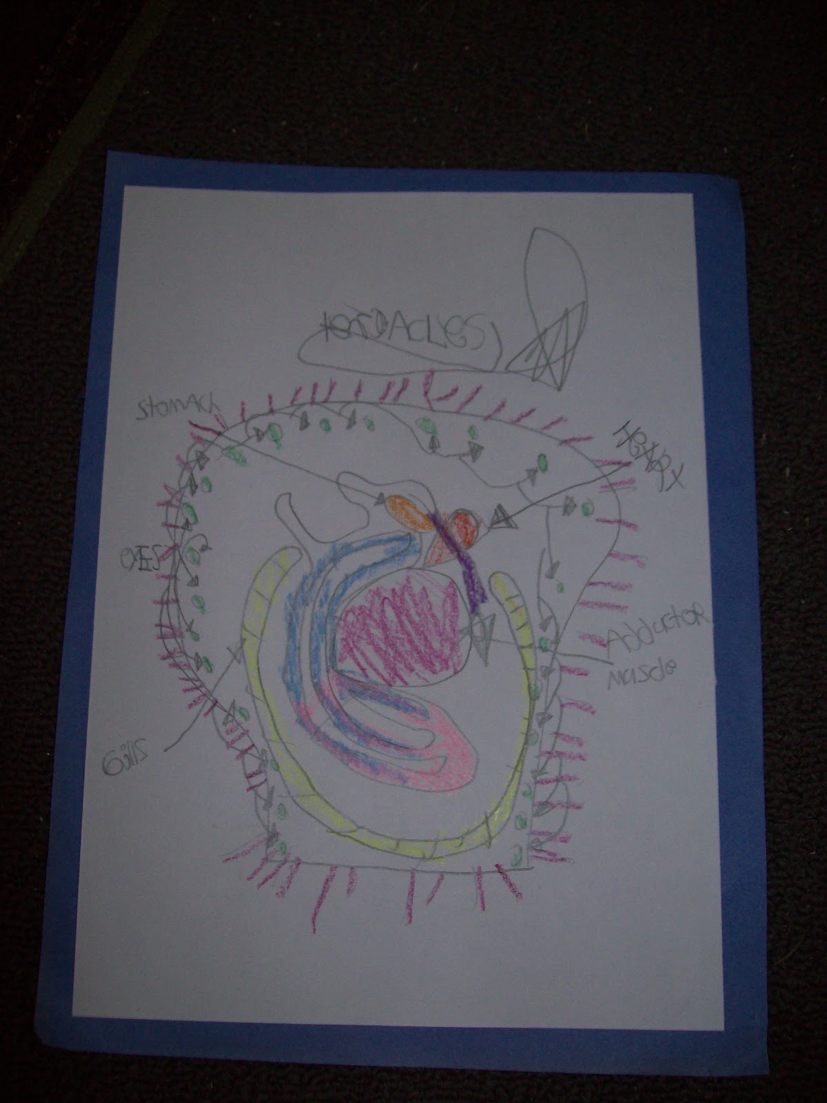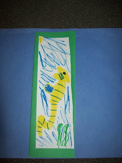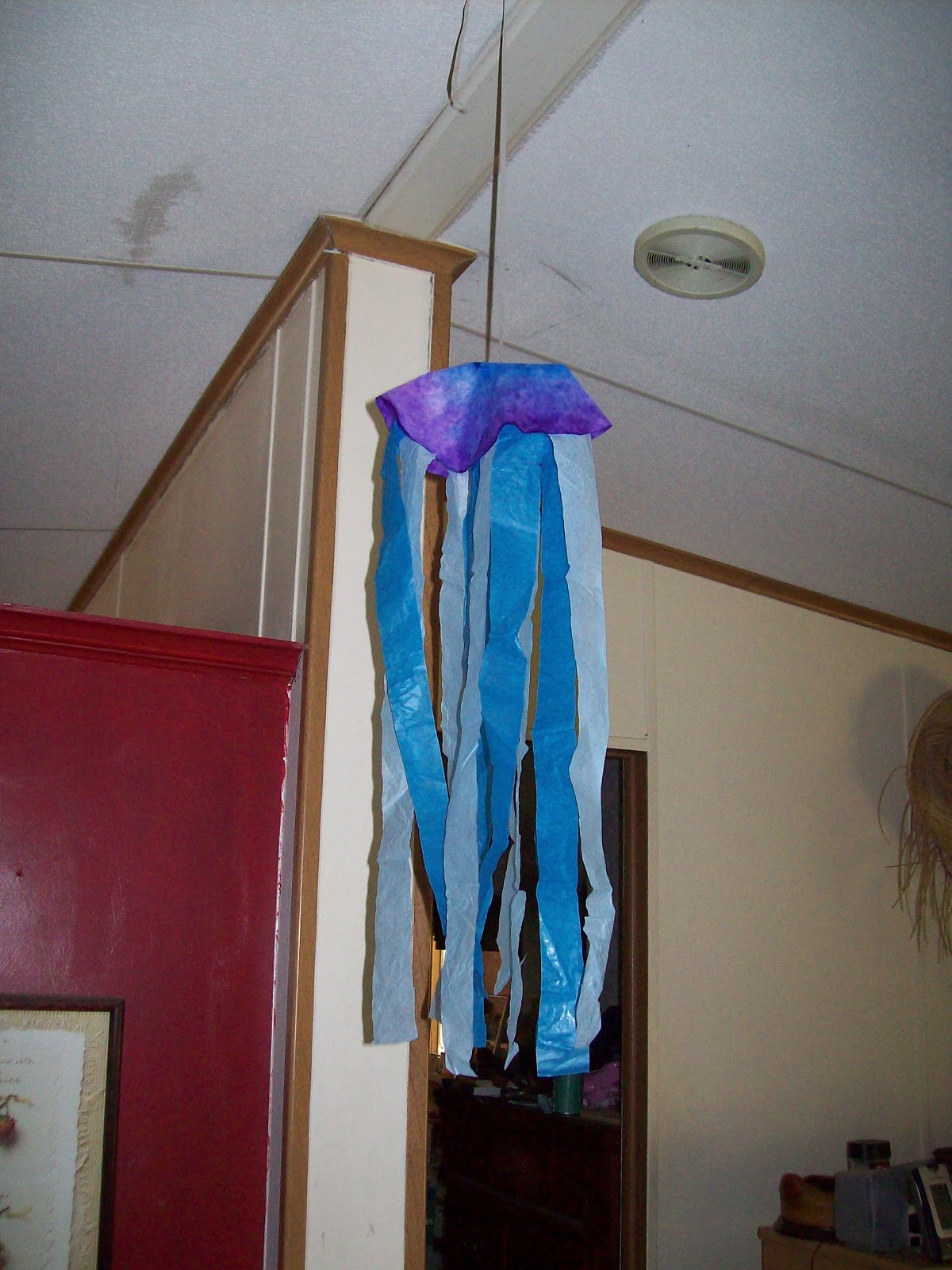 ART -We used markers to color on round coffee filters. Then we sprayed with water and let it dry. (It doesn't take long to dry at all if near a sunny window.) Then we (mom) cut strips of tissue paper and we stapled them around the ends of the coffee filter. My husband cut small squares from a cereal boxes to put underneath the jellyfish so that it would spread out more when we hung from the ceiling. We used a brad to fasten the square and ribbon to the coffee filter. Then we tacked it to the ceiling.
