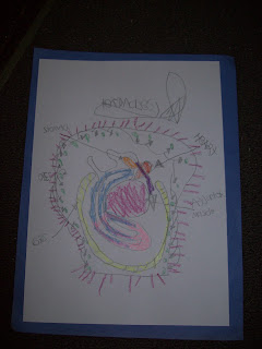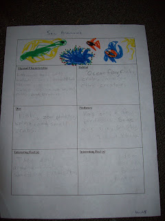 SNACK - We made a jellyfish snack with grape jello and sour gummy worms. Make the jello according to package and then put in bowls. After they have jelled in refrigerator for 4 hours, carefully flip on plate (may have to use a butter knife to gentle pry from bowl). Then add some sour gummy worms for the jellyfishes' tentacles. We actually made this twice. Ya think I would have taken a picture at least once. Maybe we can have the snack again :).